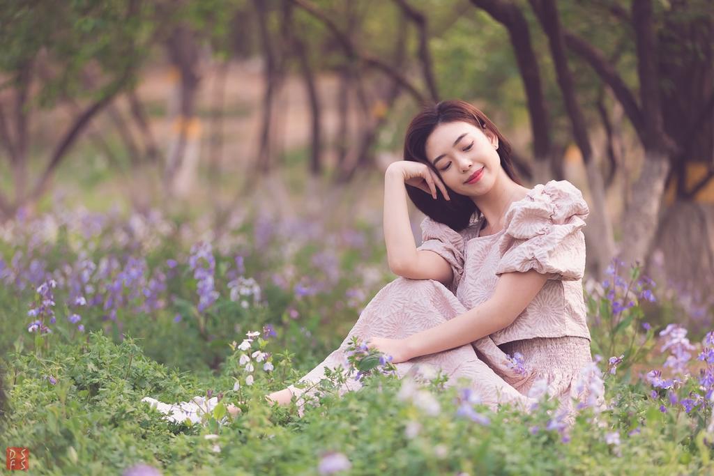 拍照不要永遠都是站著拍,可以嘗試著擺拍一個側坐的拍照姿勢,一腳自然伸直,一腳曲起來,手撐著膝蓋托著腮,這樣的姿勢很簡單很慵懶,閉上眼睛微微笑,很漂亮。