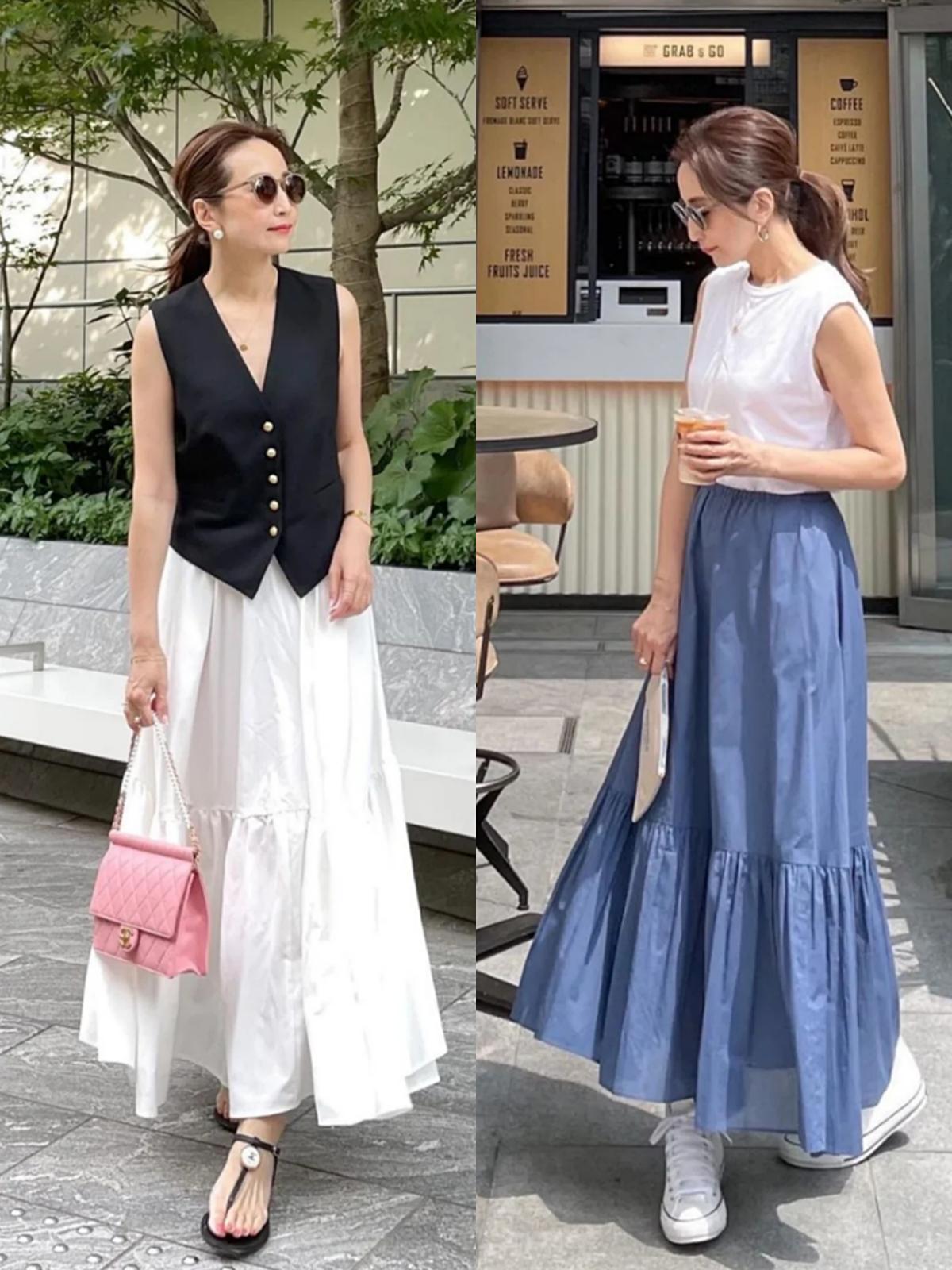 及踝半裙是很多日本中年女人衣櫥的必備款,如白色高腰及踝傘裙、藍色高腰傘裙等等。這類半裙在遮擋各種腿型缺點基礎上,又可以彰顯出熟齡女人的輕盈之美,組合無袖T恤、無袖針織衫等短上衣,顯身材又氣質。